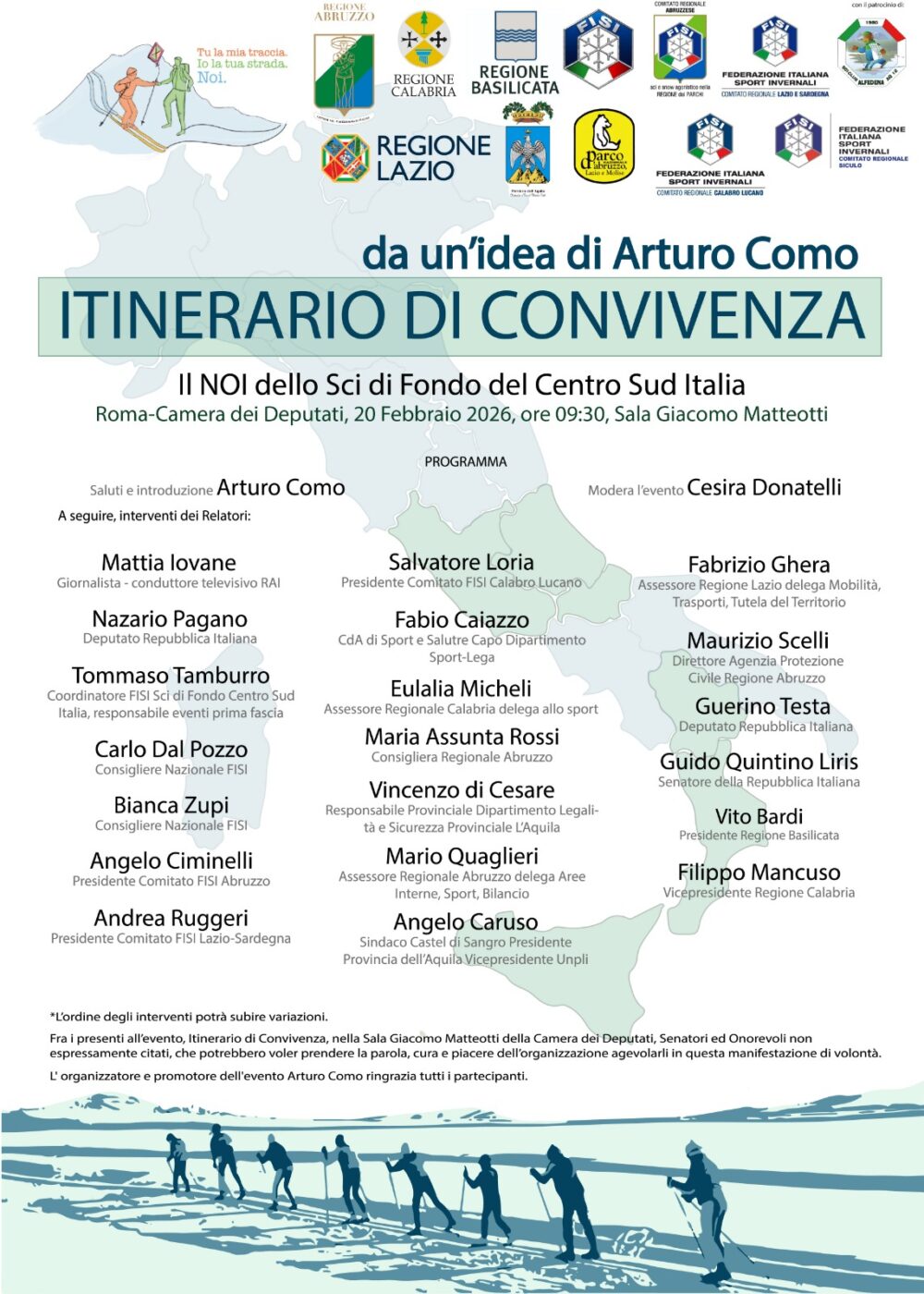 Un traguardo istituzionale per la neve. Il prossimo venerdì 20 febbraio, la Sala Giacomo Matteotti della Camera dei Deputati a Roma diventerà il cuore pulsante di una mobilitazione senza precedenti. L’intuizione di Arturo Como, che da tempo lavora per dare voce allo sci di fondo del Centro-Sud Italia, giunge su uno dei palcoscenici più prestigiosi per l’incontro-dibattito “Itinerario di Convivenza – Il NOI dello Sci di Fondo”. L’obiettivo è chiaro: garantire la sopravvivenza di una disciplina storica attraverso investimenti strutturali, in primis gli impianti di innevamento artificiale, diventati ormai l’unico baluardo contro inverni sempre più avari di precipitazioni.